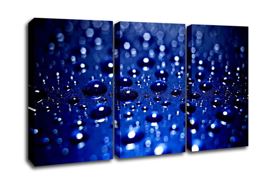 Drops On Blue 3 Panel Canvas Print handmade in the UK. Stretched over a 2 inch thick wooden box frame, ready to hang on your wall.