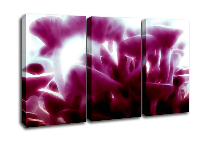 Vibrant Toad Stools 3 Panel Canvas Print handmade in the UK. Stretched over a 2 inch thick wooden box frame, ready to hang on your wall.