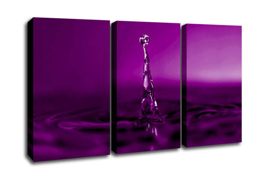 Water Drop Attention Purple 3 Panel Canvas Print handmade in the UK. Stretched over a 2 inch thick wooden box frame, ready to hang on your wall.