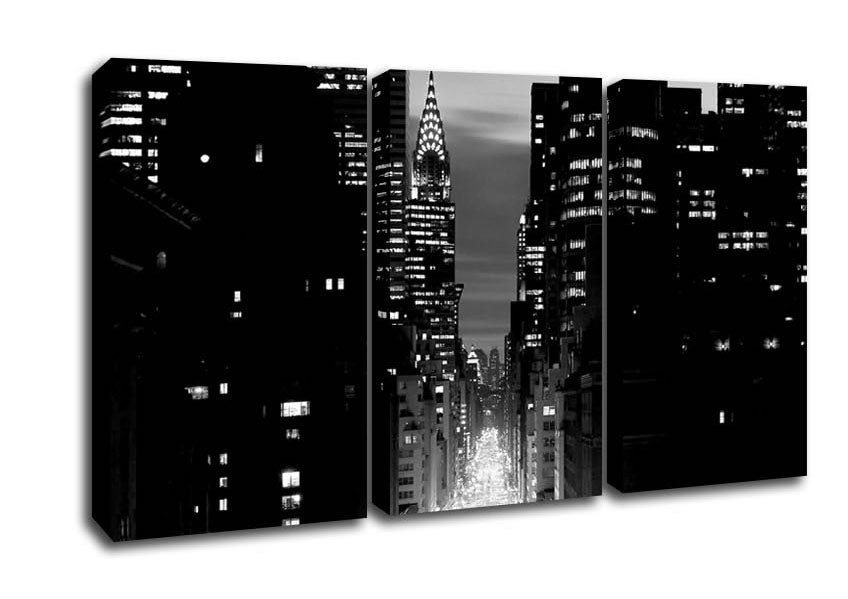View Down 5Th Avenue New York B n W 3 Panel Canvas Print handmade in the UK. Stretched over a 2 inch thick wooden box frame, ready to hang on your wall.