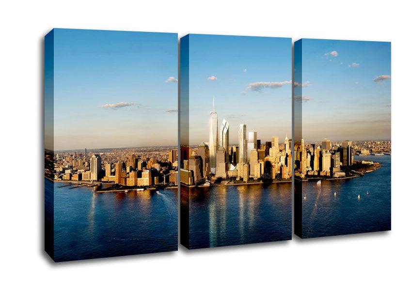 View Of New York In Golden Sunlight 3 Panel Canvas Print handmade in the UK. Stretched over a 2 inch thick wooden box frame, ready to hang on your wall.