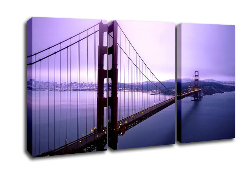 Violet Hour And Fog Surround The Golden Gate 3 Panel Canvas Print handmade in the UK. Stretched over a 2 inch thick wooden box frame, ready to hang on your wall.
