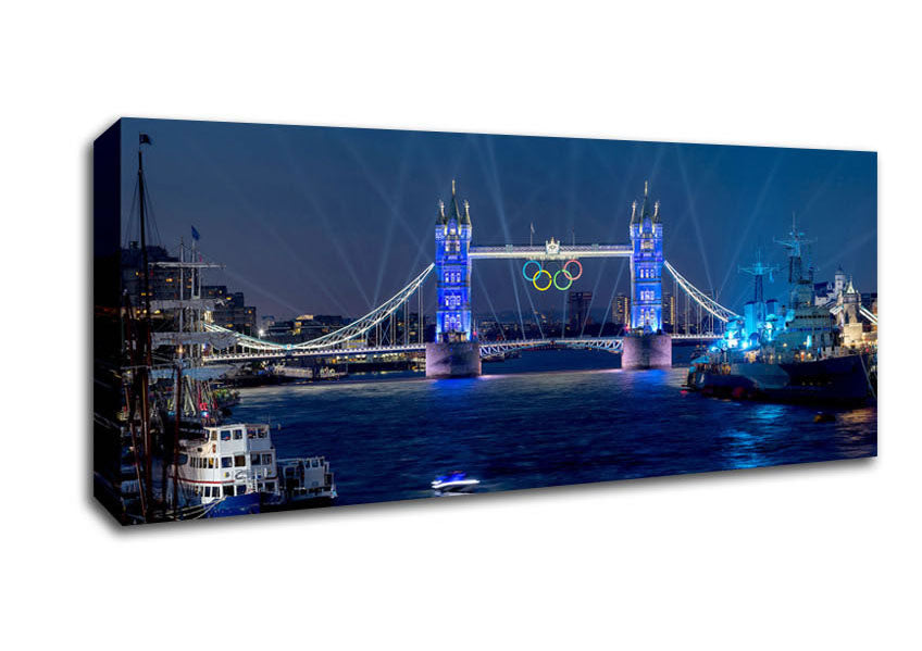 Tower Bridge Olympic Lighting London Panoramic Canvas Print handmade in the UK. Stretched over a 2 inch thick wooden box frame, ready to hang on your wall.