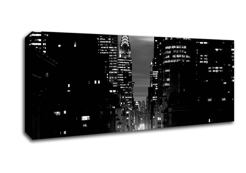 View Down 5Th Avenue New York B n W Panoramic Canvas Print handmade in the UK. Stretched over a 2 inch thick wooden box frame, ready to hang on your wall.