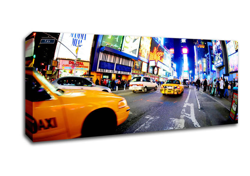 Yellow Cab New York Broadway Drive Panoramic Canvas Print handmade in the UK. Stretched over a 2 inch thick wooden box frame, ready to hang on your wall.