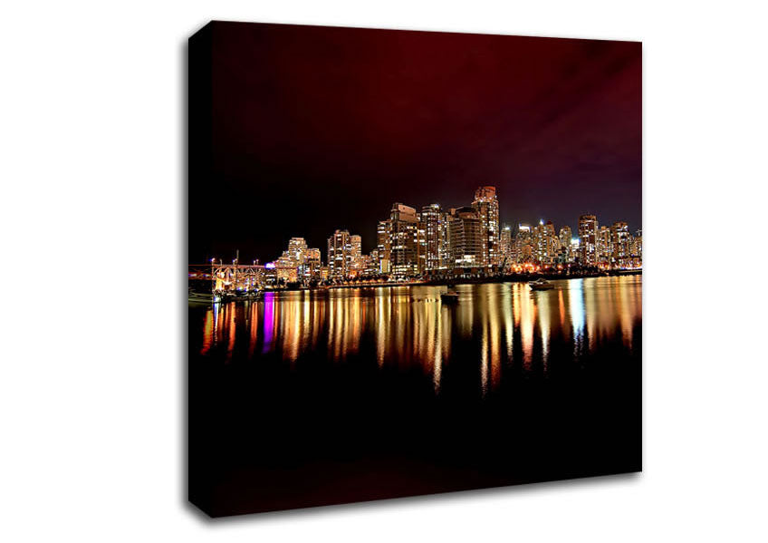 Vancouver City Nights Square Canvas Print handmade in the UK. Stretched over a 2 inch thick wooden box frame, ready to hang on your wall.