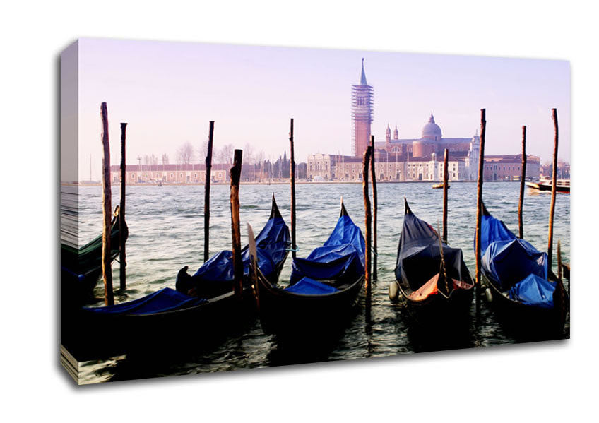 Venice Gondola Line-Up Wide Canvas Print handmade in the UK. Stretched over a 2 inch thick wooden box frame, ready to hang on your wall.