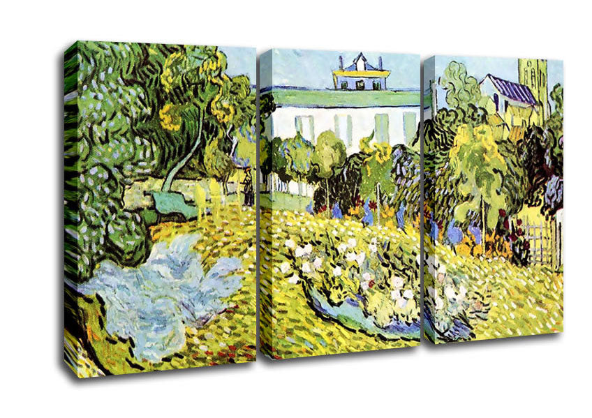 Van Gogh The Garden Of The Daubignys 3 Panel Canvas Print handmade in the UK. Stretched over a 2 inch thick wooden box frame, ready to hang on your wall.