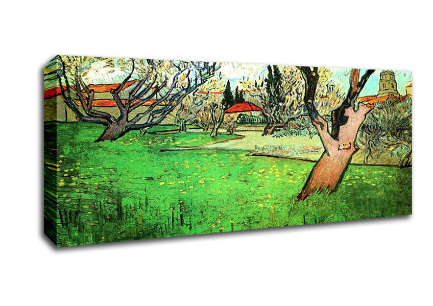 Vincent Van Gogh View Of Arles With Flowering Tree Panoramic Canvas Print handmade in the UK. Stretched over a 2 inch thick wooden box frame, ready to hang on your wall.