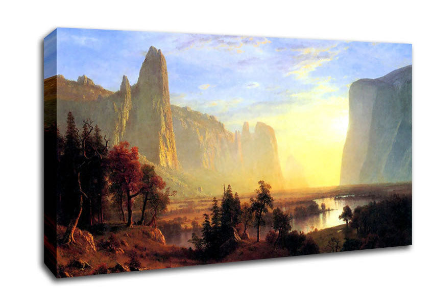 Yosemite Valley By Bierstadt Wide Canvas Print handmade in the UK. Stretched over a 2 inch thick wooden box frame, ready to hang on your wall.