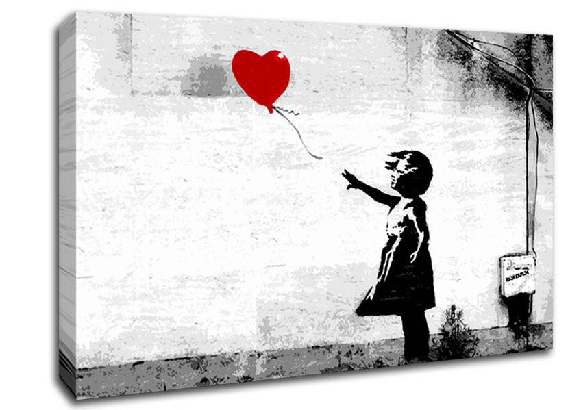 Balloon Girl Love Heart Canvas Print handmade in the UK. Stretched over a 2 inch thick wooden box frame, ready to hang on your wall.