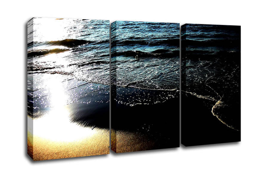 Sunshine Blaze Across The Ocean 3 Panel Canvas Print handmade in the UK. Stretched over a 2 inch thick wooden box frame, ready to hang on your wall.