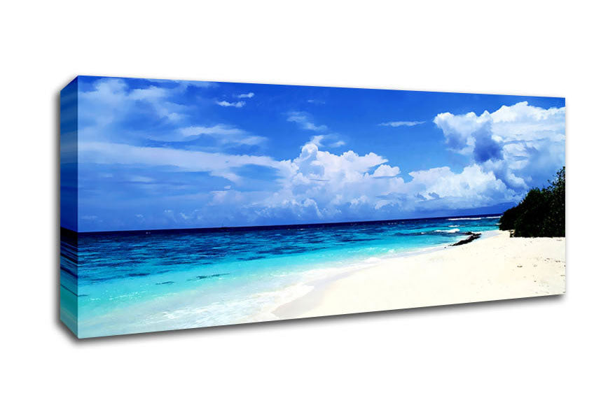 White Sands On The Paradise Island Panoramic Canvas Print handmade in the UK. Stretched over a 2 inch thick wooden box frame, ready to hang on your wall.