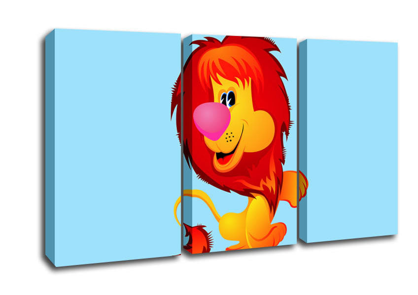 Happy Lion Baby Blue 3 Panel Canvas Print handmade in the UK. Stretched over a 2 inch thick wooden box frame, ready to hang on your wall.