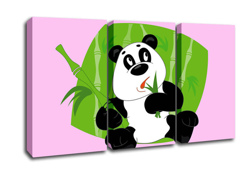 Panda Eating Bamboo Pink 3 Panel Canvas Print handmade in the UK. Stretched over a 2 inch thick wooden box frame, ready to hang on your wall.