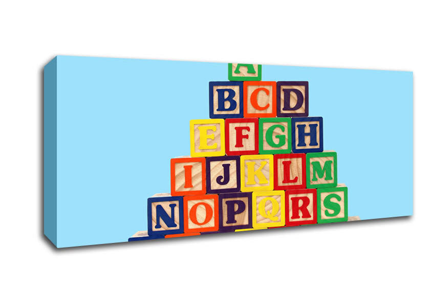 Alphabet Blocks Baby Blue Panoramic Canvas Print handmade in the UK. Stretched over a 2 inch thick wooden box frame, ready to hang on your wall.