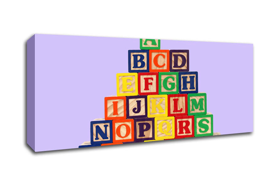 Alphabet Blocks Lilac Panoramic Canvas Print handmade in the UK. Stretched over a 2 inch thick wooden box frame, ready to hang on your wall.