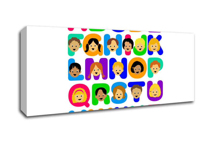 Alphabet Children White Panoramic Canvas Print handmade in the UK. Stretched over a 2 inch thick wooden box frame, ready to hang on your wall.