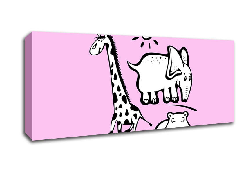 Animals Under The Sun Pink Panoramic Canvas Print handmade in the UK. Stretched over a 2 inch thick wooden box frame, ready to hang on your wall.