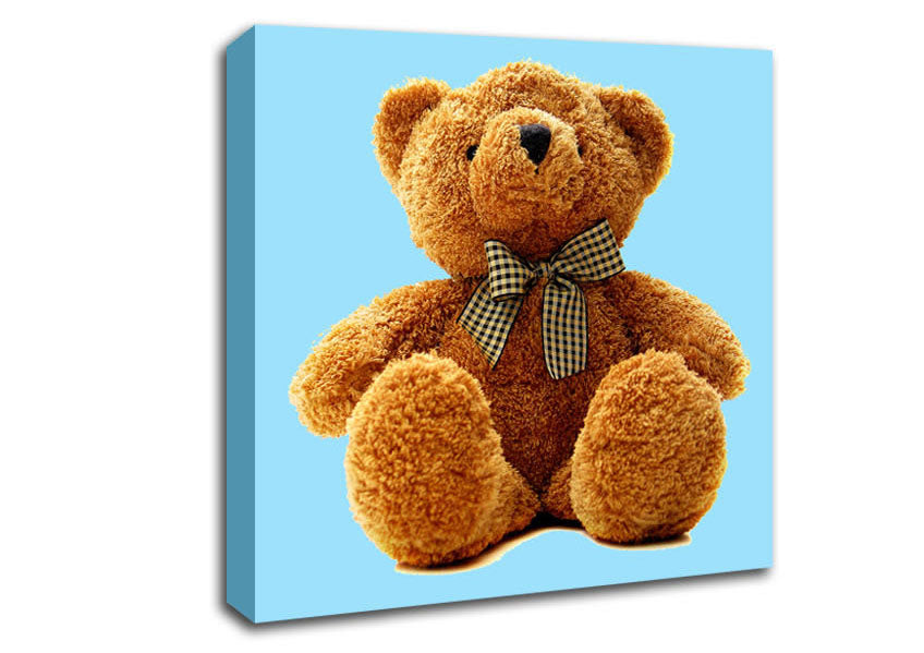 Teddy Bear Bow Baby Blue Square Canvas Print handmade in the UK. Stretched over a 2 inch thick wooden box frame, ready to hang on your wall.