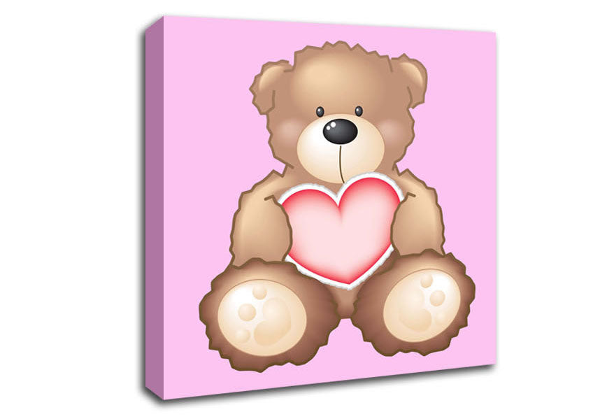 Teddy Bear Love Heart Pink Square Canvas Print handmade in the UK. Stretched over a 2 inch thick wooden box frame, ready to hang on your wall.