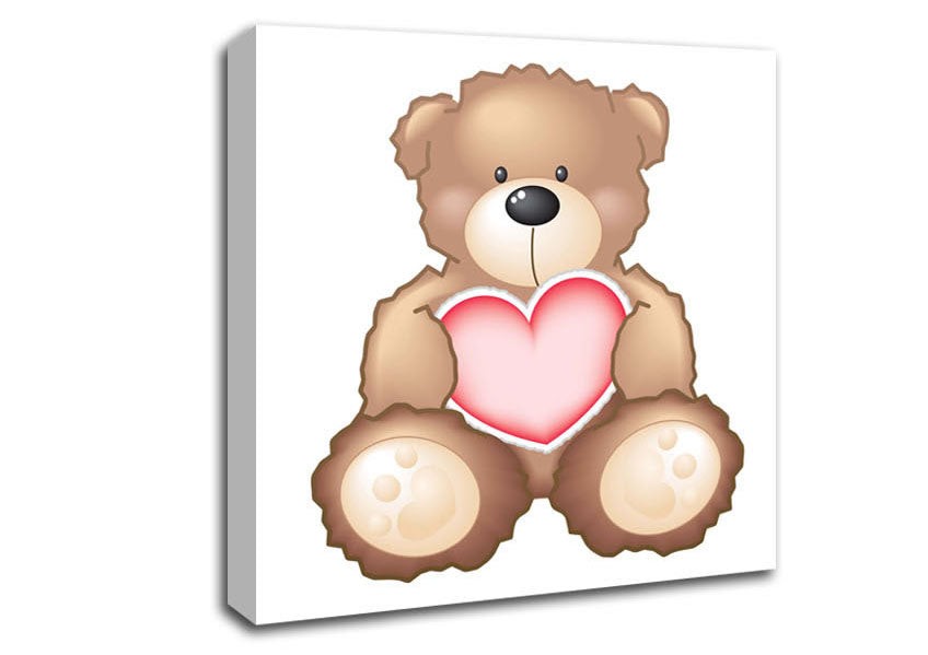 Teddy Bear Love Heart White Square Canvas Print handmade in the UK. Stretched over a 2 inch thick wooden box frame, ready to hang on your wall.