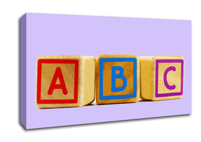 Three Alphabet Blocks Lilac Wide Canvas Print handmade in the UK. Stretched over a 2 inch thick wooden box frame, ready to hang on your wall.
