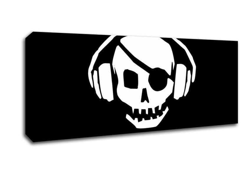 Skeleton Pirate Headphones Panoramic Canvas Print handmade in the UK. Stretched over a 2 inch thick wooden box frame, ready to hang on your wall.