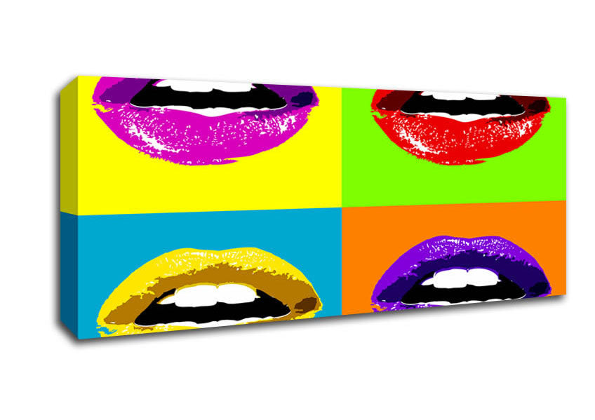 Vibrant Pop Art Lips Panoramic Canvas Print handmade in the UK. Stretched over a 2 inch thick wooden box frame, ready to hang on your wall.