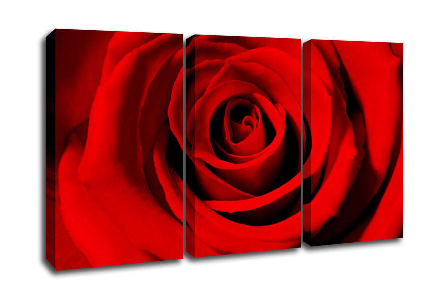 Close-Up Of The Soft Red Rose 3 Panel Canvas Print handmade in the UK. Stretched over a 2 inch thick wooden box frame, ready to hang on your wall.