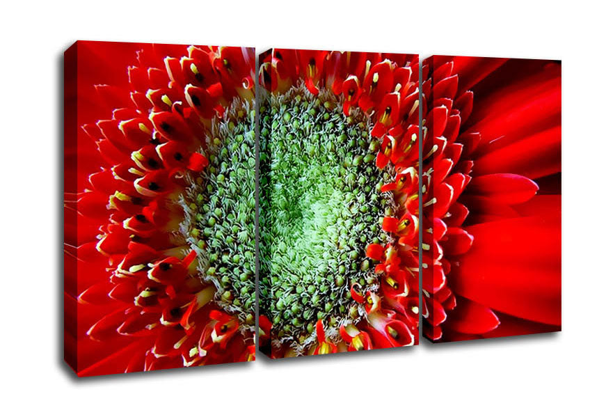 Red Gerbera Green Centre Close-Up 3 Panel Canvas Print handmade in the UK. Stretched over a 2 inch thick wooden box frame, ready to hang on your wall.