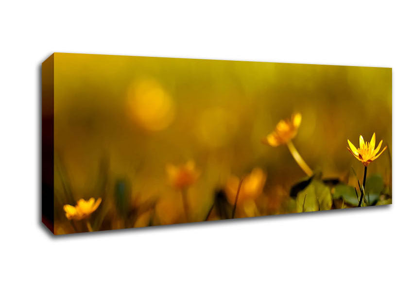 Yellow Flowers In The Golden Sun Panoramic Canvas Print handmade in the UK. Stretched over a 2 inch thick wooden box frame, ready to hang on your wall.