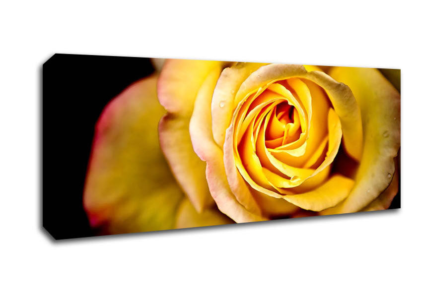 Yellow Rose Dew Drop Panoramic Canvas Print handmade in the UK. Stretched over a 2 inch thick wooden box frame, ready to hang on your wall.