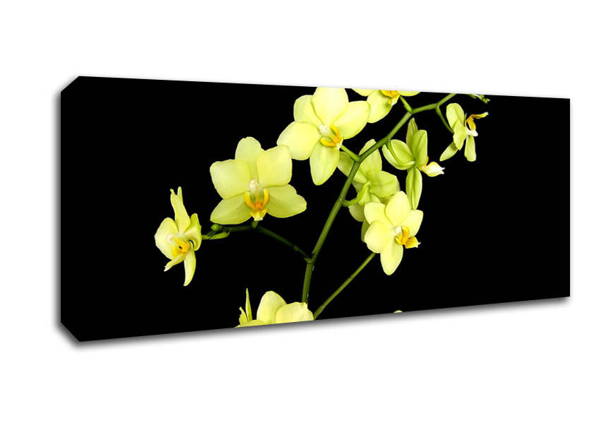 Yellow Star Flowers On Black Panoramic Canvas Print handmade in the UK. Stretched over a 2 inch thick wooden box frame, ready to hang on your wall.