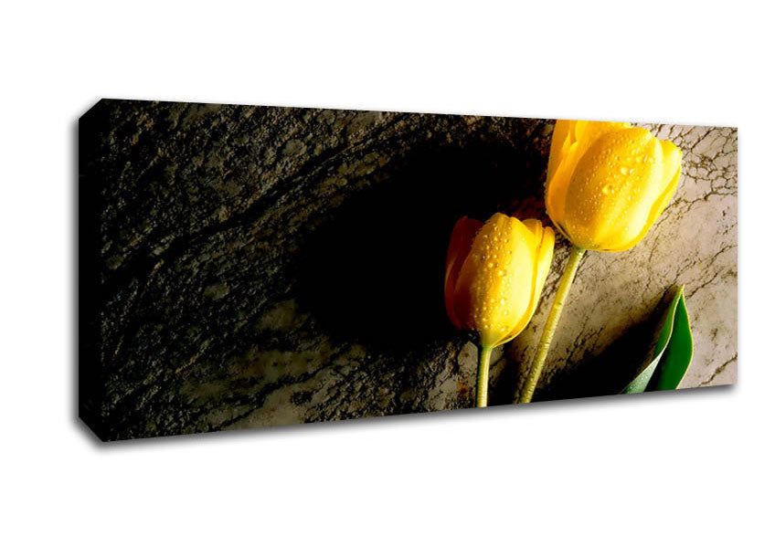 Yellow Tulip Duo Panoramic Canvas Print handmade in the UK. Stretched over a 2 inch thick wooden box frame, ready to hang on your wall.