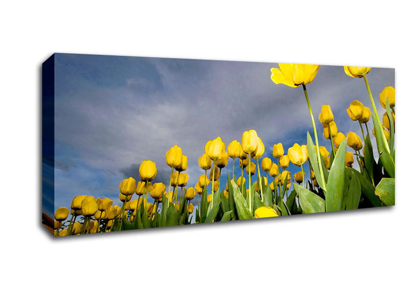 Yellow Tulip Field Storm Panoramic Canvas Print handmade in the UK. Stretched over a 2 inch thick wooden box frame, ready to hang on your wall.