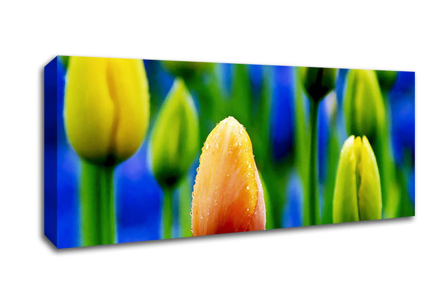 Yellow Tulips In A Blue Field Panoramic Canvas Print handmade in the UK. Stretched over a 2 inch thick wooden box frame, ready to hang on your wall.