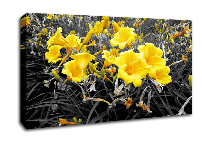 Yellow Trumpet Flowers On B n W Wide Canvas Print handmade in the UK. Stretched over a 2 inch thick wooden box frame, ready to hang on your wall.