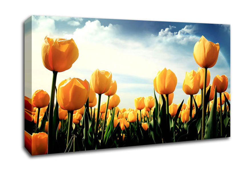 Yellow Tulips In The Cloudy Skies Wide Canvas Print handmade in the UK. Stretched over a 2 inch thick wooden box frame, ready to hang on your wall.