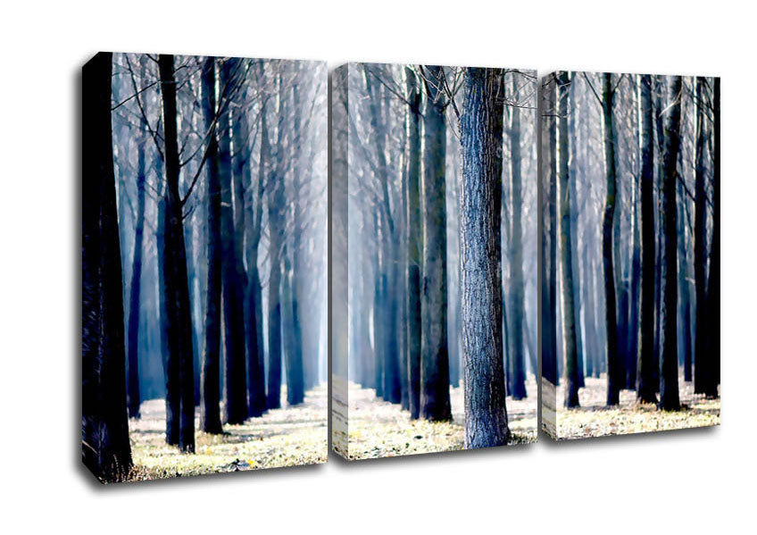 Trees Line-up In Winter 3 Panel Canvas Print handmade in the UK. Stretched over a 2 inch thick wooden box frame, ready to hang on your wall.