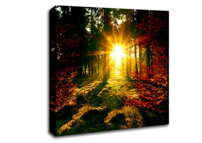 The Beaming Forest Sun Square Canvas Print handmade in the UK. Stretched over a 2 inch thick wooden box frame, ready to hang on your wall.