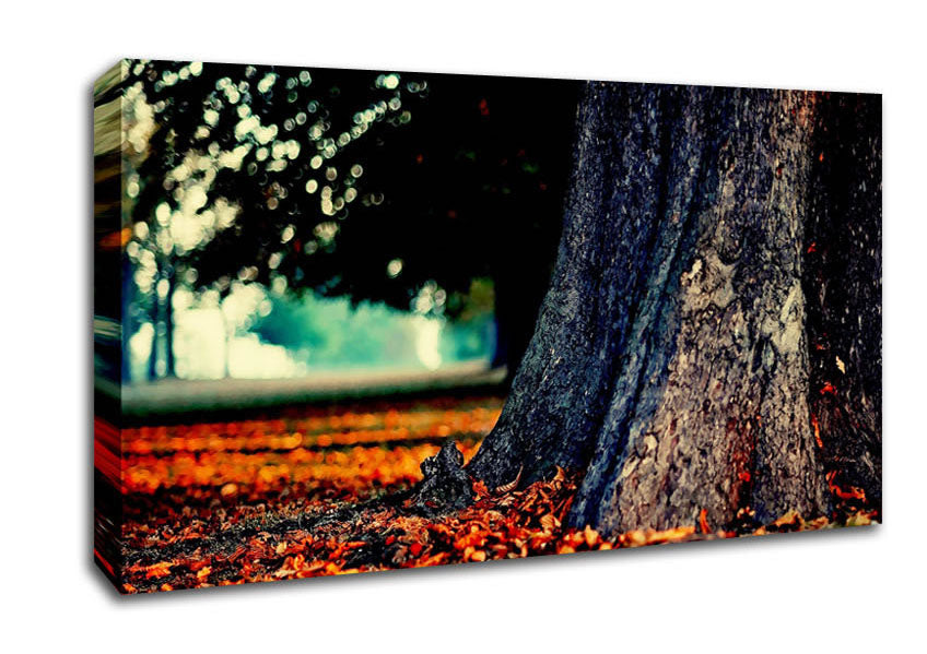 Tree Trunk In Autumn Wide Canvas Print handmade in the UK. Stretched over a 2 inch thick wooden box frame, ready to hang on your wall.