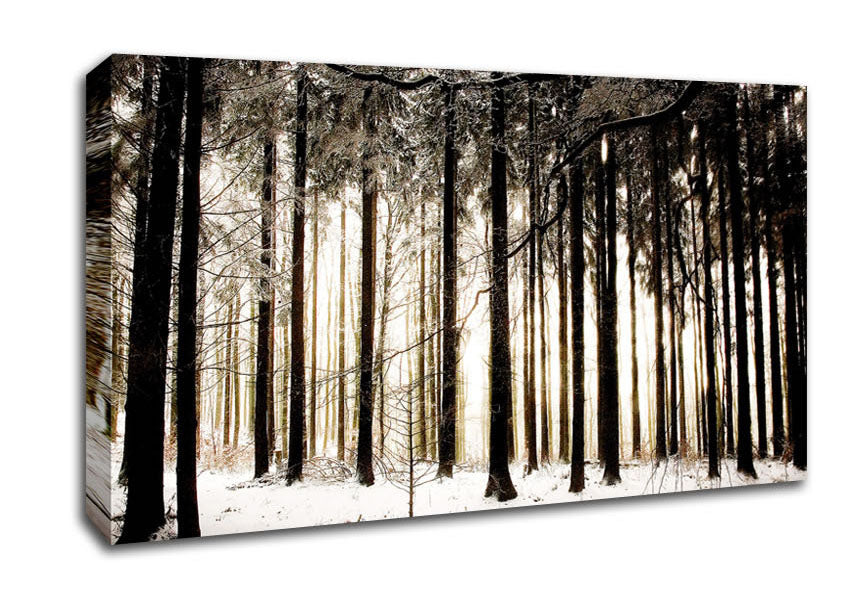Winter Forest Snow Storm Wide Canvas Print handmade in the UK. Stretched over a 2 inch thick wooden box frame, ready to hang on your wall.