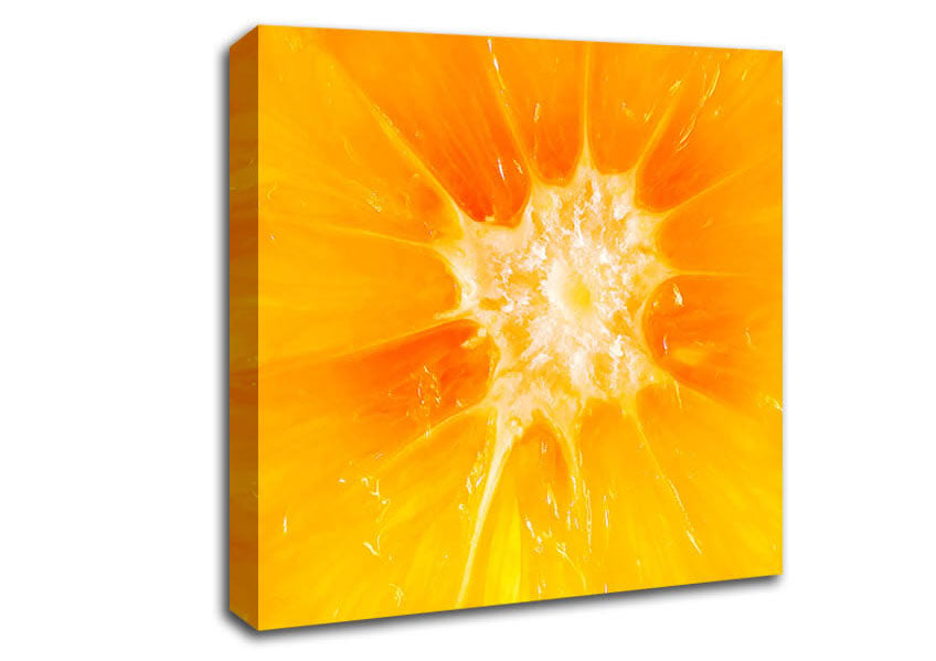 The Centre Of An Orange Square Canvas Print handmade in the UK. Stretched over a 2 inch thick wooden box frame, ready to hang on your wall.