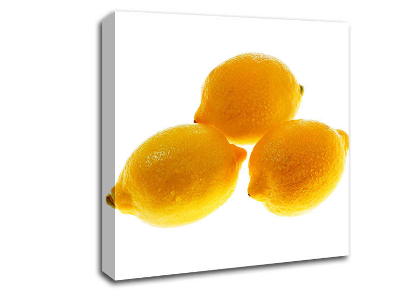 Trio Of Lemons Square Canvas Print handmade in the UK. Stretched over a 2 inch thick wooden box frame, ready to hang on your wall.