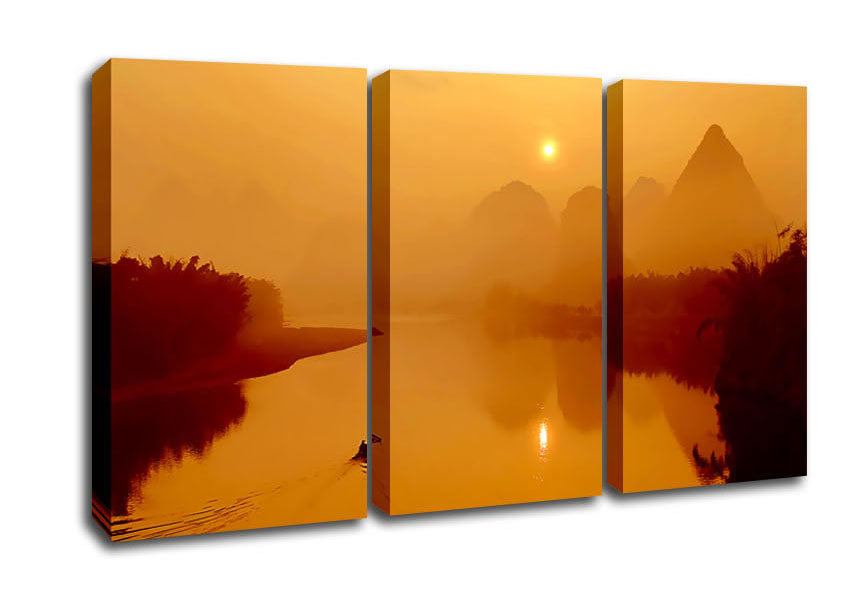 Golden Paradise Lake 3 Panel Canvas Print handmade in the UK. Stretched over a 2 inch thick wooden box frame, ready to hang on your wall.