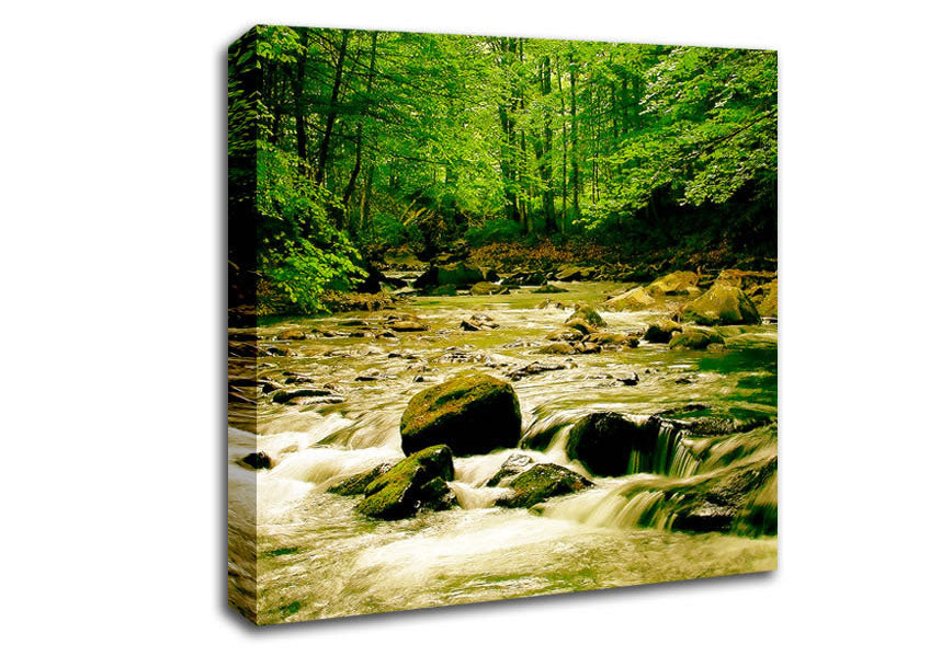 The Green River Forest Square Canvas Print handmade in the UK. Stretched over a 2 inch thick wooden box frame, ready to hang on your wall.