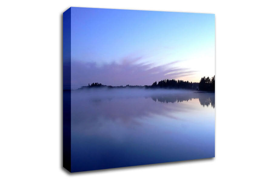 Tranquil Blue Morning Lake Square Canvas Print handmade in the UK. Stretched over a 2 inch thick wooden box frame, ready to hang on your wall.