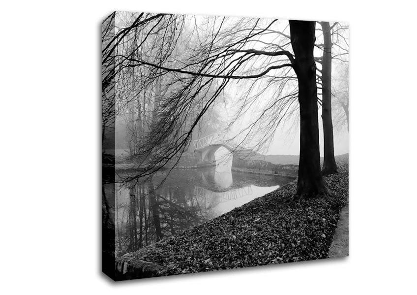 Winter River Walk B n W Square Canvas Print handmade in the UK. Stretched over a 2 inch thick wooden box frame, ready to hang on your wall.