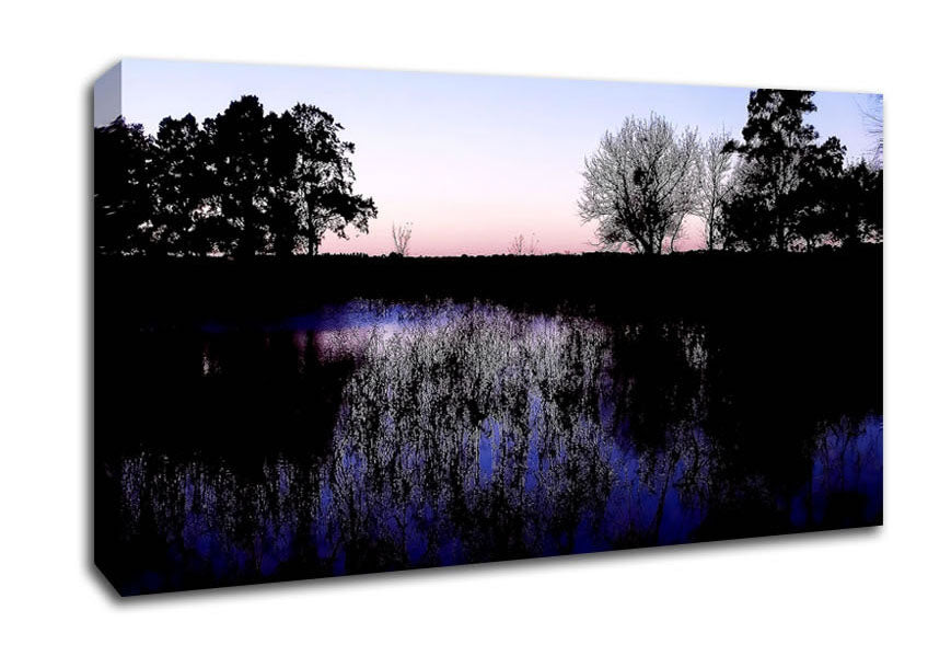 The Purple Morning Lake Wide Canvas Print handmade in the UK. Stretched over a 2 inch thick wooden box frame, ready to hang on your wall.